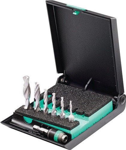 6,3 mm (1/4")-6-kant-Antrieb · bestückt mit hochwertigen HSS-Kombi-Gewindebohrern · für Hand- und Maschinenbetrieb · Besondere Produktvorteile: · nur 1 Werkzeug für drei Arbeitsgänge! · Kernloch bohren · Gewinde schneiden · Entgraten/Senken (für den Einsatz in Bohrmaschinen mit Rechts-/Linkslauf und elektronischer Drehzahlvorwahl) Inhalt: 1 Rapidaptor-Bithalter mit Schnellwechselfutter 50 mm lang, nicht magnetisch je 1 Kombi-Gewindebohrer Gr. 2,5 - 3,2 - 3,8 - 4,5 - 6,2 - 6,4, M 3 - M 4 - M 5 - M 6 - M 8 - M 10 Lieferung in Kunststoffbox · Weitere technische Eigenschaften DIN: 3126 • Verpackung: Kunststoffbox • Schneidstoff: HSS