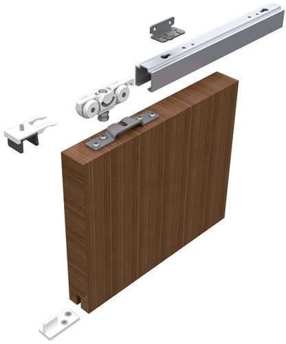 Komplettset · für einflügelige Holzschiebetüren bis 80 kg Flügelgewicht und Türstärken ab 20 mm · Rollapparate mit Kugellager und Tragschraube verz., gelb chrom., M8x35mm Inhalt: 2x HELM 73 Rollapparat mit Flansch, 2x HELM 65 P Fangstopper, 1x HELM 214 Führungsgleiter geprüft nach DIN 1527:1998 200.000 Zyklen