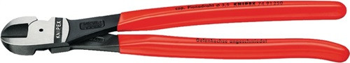 Chrom-Vanadin-Hochleistungsstahl · ölgehärtet · Schneiden zusätzlich induktiv gehärtet · Schneidenhärte ca. 64 HRC · schneidet harte, dicke Drähte mit geringerem Kraftaufwand als gleichlange Seitenschneider · mittige Präzisionsschneiden Kopf poliert · Griffe mit Kunststoffüberzug · Weitere technische Eigenschaften Material: Chrom-Vanadin-Hochleistungsstahl • Norm: DIN ISO 5743