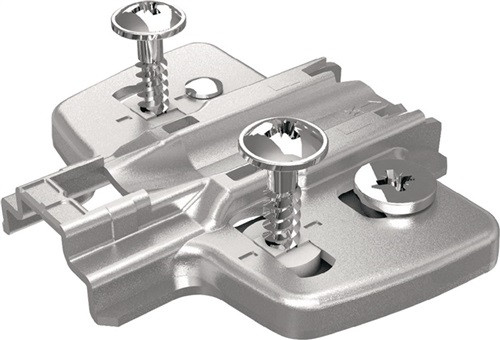 mit Exenterverstellung · Hettich Direkt für Mittelwände · Befestigung, Pilotzapfen und asymetrisch vormontierte Holzschrauben · Lochabstand 32 mm · Höhenverstellung +/-2 mm · Bohrung Ø 5 x 7,5 mm · Abstand Lochreihe 37 mm · Weitere technische Eigenschaften Oberfläche: vernickelt • Ergänzung: Exzenter-Höhenverstellung