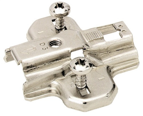 System 32 mm · mit vormontierten Pilotzapfen und asymetrisch angeordneten Spezialschrauben · für Bohrungen Ø 5 x 12 mm · Langlöcher für Höhenverstellung · vernickelt · Weitere technische Eigenschaften Oberfläche: vernickelt • Ergänzung: Langloch-Höhenverstellung