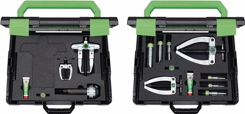 komplette Garnitur · mit Innenausziehern und Gegenstützen sowie zweiarmigen Universalabziehern Anwendung: universell einsetzbar, zum Abziehen von Kugellagern, Lagern, Zahnrädern, Schulterlagerinnenringe, Rillenkugellager etc. · auch zum Ausziehen dicht anliegender Kugellager, Kugellageraußenringe und Buchsen * Die Artikel bestehen jeweils aus 2 Koffern · Lieferung in stabiler „L-BOXX“ · Weitere technische Eigenschaften Inhalt: 6 Innenauszieher 12 - 46 mm, 2 Gegenstützen 5 - 40 mm und 18 - 70 mm, 1 Abziehfutter, 1 Batterieklemmenabzieher 55 mm, 1 zweiarmiger Abzieher 80 mm • Verpackung: in 2 x L-Boxx