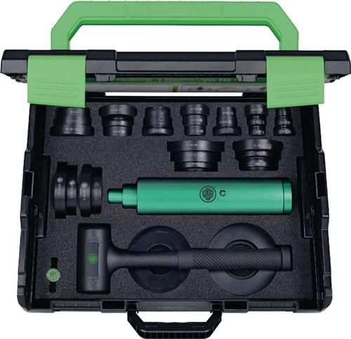 leichte Ausführung aus schlagfestem Polyacetal mit einzigartiger Arretierung · zum Einsatz auf Baustellen und bei außer Haus Montagen Anwendungsbereiche: zur sicheren, schnellen und präzisen Montage von Lagern, Buchsen, Dichtringen und Riemenscheiben · besonders geeignet zum Einsatz auf Baustellen und außer Haus Montage Produktaufwertung: Die Schlaghülsendeckel bestehen aus schlagfestem Aluminium · Weitere technische Eigenschaften Bohrungs-Ø: 10 - 50Schlagring, 18 - 32 - 52Schlaghülsemm