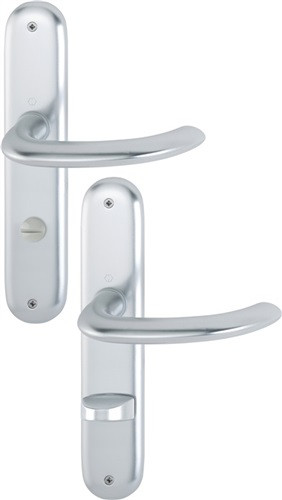 Langschild-Garnitur geprüft nach DIN EN 1906 (Benutzer-Kategorie 3) · Aluminium, F1 / naturfarbig · Türgriffe mit Schnellstift-Verbindung (mit 8 mm Vollstift) für Türstärke 35 - 45 mm und Rückholfeder · Schilder sichtbar verschraubt Entfernung 72 mm, Entfernung Bad SK/OL 78 mm · Weitere technische Eigenschaften Norm: DIN 1906