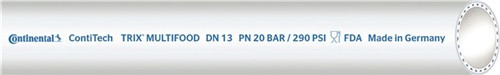 homogene, porenfreie, helle NBR-Innenschicht · absolut geruchs- und geschmacksneutral · Temperaturbereich: -20 °C bis +90 °C · dämpfbar bis 6 bar (+164 °C) zum Sterilisieren – nur offenes System · Druckträger: synthetische Garne · NBR-Außenschicht beständig gegen Abrieb, UV, Fette und Öle · Betriebsdruck bis 20 bar · entspricht den Anforderungen der EG 1935/2004 und EG 2023/2006 · entspricht FDA 177.2600 Kennzeichnung: „Continental ContiTech TRIX® MULTIFOOD DN 13 PN 20 BAR / 290 PSI Glas-/Gabel-Symbol FDA Made in Germany" auf weißem oder blauem Untergrund. Einsatzmöglichkeiten: TRIX-MULTI-FOOD® ist der universelle Schlauch für Nahrungsmittelbetriebe aller Art. Neben Molkereien, Käsereien, Margarinefabriken, Großküchen, Fischwaren- und Fischkonservenfabriken sowie Brauereien und Schlachthöfen kann er auch in Ölmühlen, Abdeckereien, Großfleischereien und Marmeladenfabriken zum Einsatz kommen. Die Benutzung des Schlauchs durch Molkereimaschinenhersteller ist möglich. Der Schlauch ist geeignet zum Durchleiten von Milch, Molke und Heißwasser mit Temperaturen bis +90 °C. · Weitere technische Eigenschaften Betriebsdruck: 20bar