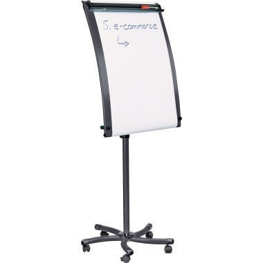 Attraktives Design-Flipchart mit hochwertiger, farbiger Beschichtung. Die ergonomisch gewölbte Oberfläche unterstützt die Hand beim Schreiben. Flexibel nutzbar mit Endlospapier oder Flipchartblöcken im Standardformat. · Masse (Gewicht): 21,5 kg · Maße der Oberfläche: 70 x 103 cm (B x H) · Maße: 70 x 210 cm (B x H) · Tafel magnethaftend: Ja · Typbezeichnung der Stativform: Einbeinstativ · Werkstoff: Stahl · Farbe: schwarz · Verstellbereich: 170-210 cm · Farbe des Gestells: schwarz · Durchmesser der Standfläche: 70 cm · Ausführung des Fußes: Sternfuß mit 5 Rollen · Ausführung der Lieferzusammenstellung: inkl. Papierrolle, Presentation Marker · Anzahl der Arme: 1 Arm · Ablageschale vorhanden: Ja · Gesamthöhe: 210 cm · höhenverstellbar: Ja