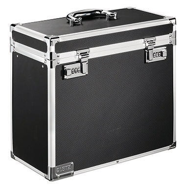 Mit Aluminium Umrandungen und verstärkten Metallecken, Zahlenschloß und Tragegriffen. · rutschfest: Ja · max. Anzahl der Hängemappen: 15 Hängemappen · Werkstoff: Holz, kunststoffbeschichtet · Verwendung für Papierformat: DIN A4 · Tiefe: 165 mm · Anzahl der Ordner: 2 Ordner · Höhe: 3310 mm · Griff vorhanden: Ja · Farbe: schwarz/chrom · Breite: 366 mm · Maße: 36,6 x 31 x 16,5 cm (B x H x T) · Schloss vorhanden: Ja