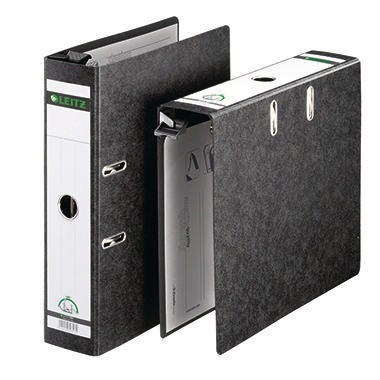 50 % weitere Mechaniköffnung für schnelleres und komfortableres Arbeiten. Ablegen auch auf der linken Seite möglich. Mit Hängeschwenkbügel aus Kunststoff (POM). Die Schwenkbügel werden zum Hängen aus- oder zum Stellen eingeklappt. 5 Jahre Garantie auf die Mechanik. · max. Anzahl der Blätter: 600 Bl. (80 g/m²) · Material des Bügels: Kunststoff (POM) · Zertifikat/Zulassung: Blauer Engel · Werkstoff: Hartpappe, recycelt · Verwendung für Papierformat: DIN A4 · Typbezeichnung der Ordnermechanik: 180° Präzisionshebelmechanik · Stärke: 2,4 mm · Schlitze vorhanden: Ja · Blauer Engel: Ja · Maße: 26,5 x 32 cm (B x H) · Höhe: 320 mm · Griffloch vorhanden: Ja · Forest Stewardship Council (FSC): Ja · Farbe: schwarz · Breite: 265 mm · Rückenbreite: 80 mm