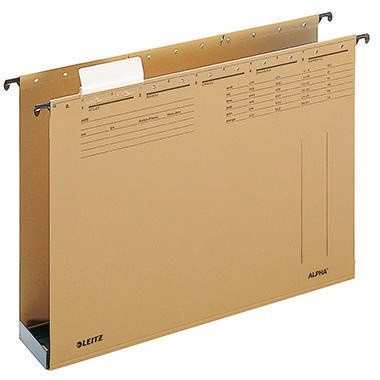 Hängesammler ALPHA® für lose Blattablage von Einzelakten. Hängeschiene mit Hängenasen. · Farbe: naturbraun · Zertifikat/Zulassung: Blauer Engel · Werkstoff: Natronkarton, recycelt · Verwendung für Papierformat: DIN A4 · Verwendung für Hängeregistratur: ALPHA® · Seitenbegrenzung vorhanden: Ja · Material des Bodens: Kunststoff · Grammatur: 320 g/m² · Blauer Engel: Ja · Ausführung der Lieferzusammenstellung: inkl. Reiter, auswechselbaren Beschriftungsschildern · Anordnung der Lage (Öffnungsseite): oben, links, rechts offen · Länge des Gefäßbodens: 60 mm
