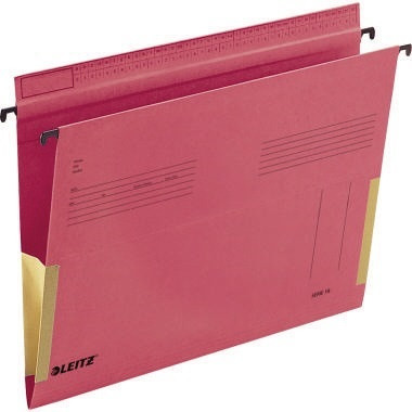 Mit Schlitzstanzung am Vorderdeckel für Heftstreifen 6130. Ausführung: Seitlich mit Fröschen verschlossen. Maße nach DIN 821. Mit überstehendem Reiterfalz, Metall-Hängeschienen mit kunststoffummantelten Hängenasen. · Grammatur: 320 g/m² · Zertifikat/Zulassung: Blauer Engel · Werkstoff: Manilakarton · Verwendung für Papierformat: DIN A4 · Verwendung für Hängeregistratur: SERIE 18 · Maße: 31,8 x 25 cm (B x H) · Farbe: rot · Blauer Engel: Ja · Ausführung des Inhalts (bezüglich der Hauptausstattungsteile: überstehender Reiterfalz, Metall-Hängeschienen mit kunststof · Anordnung der Lage (Öffnungsseite): oben offen · Organisationsaufdruck vorhanden: Ja