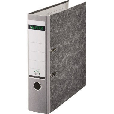 50% weitere Mechaniköffnung für schnelleres und komfortableres Arbeiten. Ablegen auch auf der linken Seite möglich. Mit aufgeklebtem Rückenschild. 5 Jahre Garantie auf die Mechanik. · max. Anzahl der Blätter: 600 Bl. (80 g/m²) · Rückenbreite: 80 mm · Schlitze vorhanden: Ja · Sichttasche am Rücken vorhanden: Nein · Typbezeichnung der Ordnermechanik: 180° Präzisionshebelmechanik · Typbezeichnung des Motivs: Wolkenmarmor · Verwendung für Papierformat: DIN A4 · Zertifikat/Zulassung: Blauer Engel · Maße: 28,5 x 31,8 cm (B x H) · Material der Kaschierung außen: Papier · Werkstoff: Graupappe, recycelt · Ausführung der Ablagemechanik: 2 Bügel · Kantenschutz vorhanden: Ja · Höhe: 318 mm · Griffloch vorhanden: Ja · gekürzte Hersteller-Artikelnummer: 1080 · Forest Stewardship Council (FSC): Ja · Farbe des Rückens: grau · Deckblatt vorhanden: Ja · Breite: 285 mm · Blauer Engel: Ja · Material der Kaschierung innen: Papier