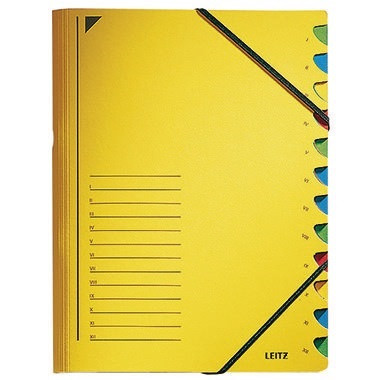Praktische Lösung zur Ablage von Projektunterlagen. Unterlagen können nach Art oder Dringlichkeit in verschiedene Fächer einsortiert werden. Mit farbigen Greifausschnitten. · Forest Stewardship Council (FSC): Ja · Grammatur: 300 g/m² · Greifausschnitt vorhanden: Ja · Höhe: 320 mm · Maße: 24,5 x 32 cm (B x H) · Verwendung für Papierformat: DIN A4 · Flächenmaße des Einbandes: 400 g/m² · Art des Verschlusses: Gummizugverschluss · Material des Einbandes: 100 % Primärkarton · Anzahl der Fächer: 12 Fächer · Beschriftungsfeld vorhanden: Ja · 3 Klappen (Jurisklappen) am Unterdeckel vorhanden: Nein · Farbe: gelb · Ausführung der Tabe: blanko · Blauer Engel: Nein · Breite: 245 mm · Farbe des Fächerblocks: mehrfarbig