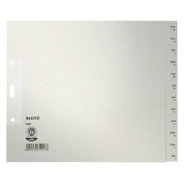 Mit Lochverstärkung des 1. Blattes. · Farbe: grau · Anzahl der Registerblätter: 12 Registerblätter · Werkstoff: Tauenpapier, recycelt · Verwendung für Papierformat: DIN A4, Überbreite · Verwendung für Druck- oder Schreibgerät: Schreibgeräte · Maße: 24 x 20 cm (B x H) · Lochrandverstärkung vorhanden: Ja · Ausführung der Lochung: 2fach Lochung · Zertifikat/Zulassung: Blauer Engel · Breite: 240 mm · Blauer Engel: Ja · Ausführung des Registers: halbe Höhe · Ausführung der Tabe: Dez.-Jan. · Grammatur: 100 g/m² · Höhe: 200 mm