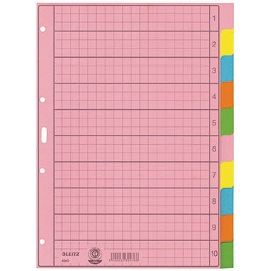 Für eine übersichtliche Organisation. Blanko Taben zur individuellen Beschriftung der Unterlagen. · Farbe: mehrfarbig · Werkstoff: Tauenpapier, recycelt · Verwendung für Papierformat: DIN A4 · Verwendung für Druck- oder Schreibgerät: Schreibgeräte · Maße: 22,5 x 30 cm (B x H) · Grammatur: 130 g/m² · Deckblatt vorhanden: Ja · Breite: 225 mm · Ausführung des Registers: volle Höhe · Ausführung der Tabe: blanko · Ausführung der Lochung: 4fach Lochung · Höhe: 300 mm · Anzahl der Registerblätter: 10 Registerblätter