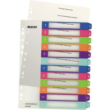 Mit PC-beschriftbarem Deckblatt für die individuelle Gestaltung der Inhaltsübersicht. · Farbe: farbig sortiert · Werkstoff: Polypropylen · Verwendung für Papierformat: DIN A4, Überbreite · Verwendung für Druck- oder Schreibgerät: Laserdrucker, Farblaserdrucker, Inkjetdrucker, Matrixdrucker · Stärke: 0,3 mm · Maße: 24,5 x 30,5 cm (B x H) · Forest Stewardship Council (FSC): Ja · Breite: 245 mm · Ausführung des Registers: volle Höhe · Ausführung der Tabe: 01. Dez · Ausführung der Lochung: Universallochung · Anzahl der Registerblätter: 12 Registerblätter · Höhe: 305 mm