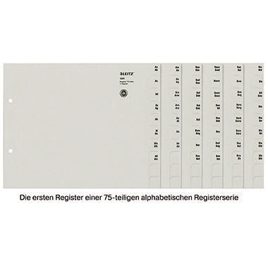 Jeder Vorgang liegt unter der entsprechenden Buchstabenkombination. Inklusive Inhaltsschildern zur Kennzeichnung des Ordnerinhaltes. Mit Lochrandverstärkung des 1. Blattes. · Farbe: grau · Lochrandverstärkung vorhanden: Ja · Werkstoff: Tauenpapier, recycelt · Maße: 24 x 20 cm (B x H) · Zertifikat/Zulassung: Blauer Engel · Grammatur: 100 g/m² · Ausführung: halbe Höhe · Ausführung der Tabe: A-Z · Ausführung der Lochung: 2fach Lochung · Ausführung der Lieferzusammenstellung: inkl. Inhaltsschilder · Anzahl der Registerblätter: 750 Registerblätter · Anzahl der Ordner: 75 Ordner · Verwendung für Papierformat: DIN A4, Überbreite · Blauer Engel: Ja