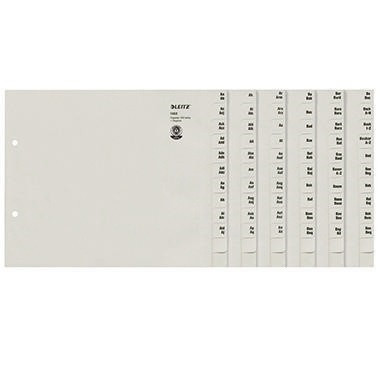 Jeder Vorgang liegt unter der entsprechenden Buchstabenkombination. Inklusive Inhaltsschildern zur Kennzeichnung des Ordnerinhaltes. Mit Lochrandverstärkung des 1. Blattes. · Werkstoff: Tauenpapier, recycelt · Farbe: grau · Verwendung für Papierformat: DIN A4, Überbreite · Maße: 24 x 20 cm (B x H) · Lochrandverstärkung vorhanden: Ja · Grammatur: 100 g/m² · Zertifikat/Zulassung: Blauer Engel · Ausführung: halbe Höhe · Ausführung der Tabe: A-Z · Ausführung der Lochung: 2fach Lochung · Ausführung der Lieferzusammenstellung: inkl. Inhaltsschilder · Anzahl der Registerblätter: 1.200 Registerblätter · Anzahl der Ordner: 100 Ordner · Blauer Engel: Ja