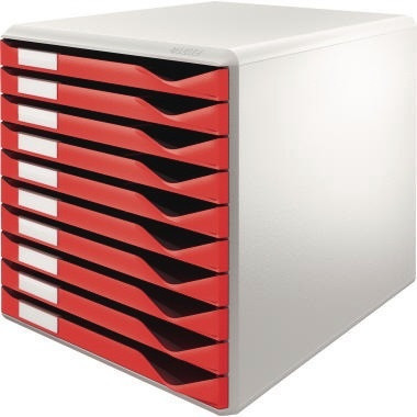 Mit Schubladeneinzug und rutschfesten Gummifüßchen. · Werkstoff: Polystyrol · Griffloch vorhanden: Nein · Höhe der Schublade: 22 mm · Höhe: 292 mm · Maße: 28,5 x 29 x 35,5 cm (B x H x T) · rutschfest: Ja · stapelbar: Ja · Verwendung für Papierformat: DIN A4 · Gehäusefarbe: lichtgrau · Tiefe: 352 mm · Farbe der Schublade: rot · Breite: 291 mm · Beschriftungsschild vorhanden: Ja · Auszugsperre vorhanden: Ja · Ausführung des Öffnungszustandes: geschlossen · Ausführung der Lieferzusammenstellung: inkl. Gummifüßchen · Art der Verwendung: Formular-Set · Anzahl der Schubfächer: 10 Schubfächer · Format der Schubladen: 10 x schmal · Griffmulde vorhanden: Ja