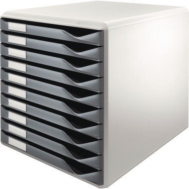 Mit Schubladeneinzug und rutschfesten Gummifüßchen. · Format der Schubladen: 10 x schmal · Griffmulde vorhanden: Ja · Verwendung für Papierformat: DIN A4 · Tiefe: 352 mm · stapelbar: Ja · rutschfest: Ja · Maße: 28,5 x 29 x 35,5 cm (B x H x T) · Höhe: 292 mm · Höhe der Schublade: 22 mm · Werkstoff: Polystyrol · Ausführung der Lieferzusammenstellung: inkl. Gummifüßchen · Griffloch vorhanden: Nein · Art der Verwendung: Formular-Set · Ausführung des Öffnungszustandes: geschlossen · Auszugsperre vorhanden: Ja · Beschriftungsschild vorhanden: Ja · Breite: 291 mm · Farbe der Schublade: dunkelgrau · Gehäusefarbe: lichtgrau · Anzahl der Schubfächer: 10 Schubfächer