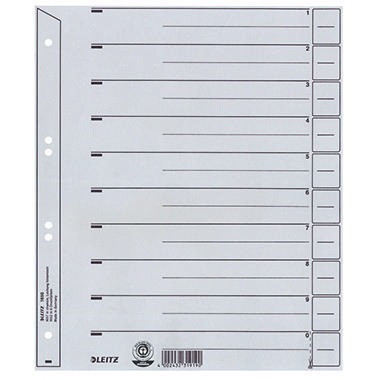 Damit Prospekthüllen nicht überstehen. · Linienaufdruck vorhanden: Ja · Höhe: 300 mm · Lochrandverstärkung vorhanden: Ja · Packungsmenge: 100 St./Pack. · Verwendung für Papierformat: DIN A4, Überbreite · Werkstoff: Kraftkarton, recycelt · Grammatur: 200 g/m² · Zertifikat/Zulassung: Blauer Engel · Ausführung der Lochung: 6fach Lochung · Art der Lochrandverstärkung: hinterklebt · Ausführung der Tabe: blanko · Blauer Engel: Ja · Maße: 24 x 30 cm (B x H) · Breite: 240 mm · Anzahl der Tabe: 10 Taben · Farbe des Aufdrucks: schwarz · Farbe: grau