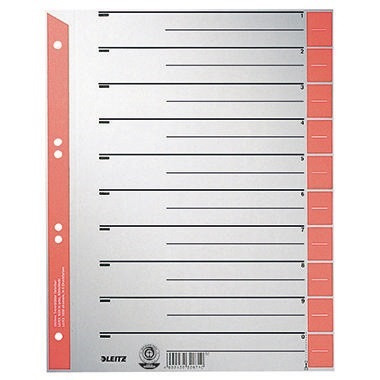 Zur einfachen Beschriftung, für eine übersichtliche Organisation. · Höhe: 300 mm · Werkstoff: Kraftkarton, recycelt · Verwendung für Papierformat: DIN A4, Überbreite · Packungsmenge: 100 St./Pack. · Maße: 24 x 30 cm (B x H) · Lochrandverstärkung vorhanden: Ja · Linienaufdruck vorhanden: Ja · Zertifikat/Zulassung: Blauer Engel · Anzahl der Tabe: 10 Taben · Farbe: rot · Farbe des Aufdrucks: schwarz · Breite: 240 mm · Blauer Engel: Ja · Ausführung der Tabe: blanko · Ausführung der Lochung: 6fach Lochung · Art der Lochrandverstärkung: hinterklebt · Grammatur: 230 g/m²
