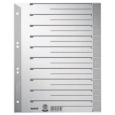 Zur einfachen Beschriftung, für eine übersichtliche Organisation. · Farbe: grau · Linienaufdruck vorhanden: Ja · Werkstoff: Kraftkarton, recycelt · Verwendung für Papierformat: DIN A4, Überbreite · Packungsmenge: 100 St./Pack. · Maße: 24 x 30 cm (B x H) · Lochrandverstärkung vorhanden: Ja · Zertifikat/Zulassung: Blauer Engel · Ausführung der Lochung: 6fach Lochung · Anzahl der Tabe: 10 Taben · Höhe: 300 mm · Art der Lochrandverstärkung: hinterklebt · Grammatur: 230 g/m² · Ausführung der Tabe: blanko · Blauer Engel: Ja · Breite: 240 mm · Farbe des Aufdrucks: schwarz