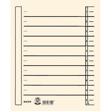 Damit Prospekthüllen nicht überstehen. · Packungsmenge: 100 St./Pack. · Grammatur: 200 g/m² · Zertifikat/Zulassung: Blauer Engel · Verwendung für Papierformat: DIN A4, Überbreite · Maße: 24 x 30 cm (B x H) · Lochrandverstärkung vorhanden: Ja · Linienaufdruck vorhanden: Ja · Höhe: 300 mm · Art der Lochrandverstärkung: hinterklebt · Farbe des Aufdrucks: schwarz · Breite: 240 mm · Blauer Engel: Ja · Ausführung der Tabe: blanko · Anzahl der Tabe: 10 Taben · Ausführung der Lochung: 6fach Lochung · Farbe: chamois · Werkstoff: Kraftkarton, recycelt
