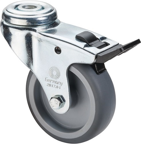 Gehäuse aus Stahlblech, verzinkt-chromatiert, korrosionsunempfindlich, zweireihiger Kugelkranz im Gabelkopf, thermoplastische Gummibereifung (blaugrau) auf Kunststoff-Felge,Gleitlager, Befestigung durch Rückenloch-D. 10,2 mm · Weitere technische Eigenschaften Oberfläche Gehäuse: verzinkt-chromatiert • Schraubloch-Ø: 10,2mm • Material Gehäuse: Stahlblech