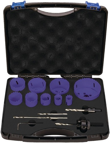 HSS-Co8 · 4/6-Kombizahn · zum Schneiden von Löchern in legierte (rostfreie), unlegierte Stähle, Aluminium, Guss, Kupfer, Bronze, Holz und Kunststoffen · Schnitttiefe 38 mm · Inhalt: je 1 Lochsäge Ø 19, 22, 29, 35, 38, 44, 51, 57 und 68 mm Jeder Satz inkl. je 1 Aufnahmeschaft in den Größen 9,5 und 11 mm je 1 Ersatzspiralbohrer