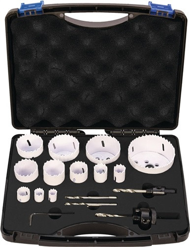 Bi-Metall · 4/6-Kombizahn · zum Schneiden von Löchern in unlegierte Stähle, Aluminium, Guss, Kupfer, Bronze, Holz und Kunststoffen · Schnitttiefe 38 mm · speziell für Elektriker · Inhalt: je 1 Lochsäge Ø 16, 19, 22, 25, 29, 32, 35, 38, 44, 51, 64 und 76 mm je 1 Aufnahmeschaft in den Größen 9,5 und 11 mm 1 Ersatzspiralbohrer