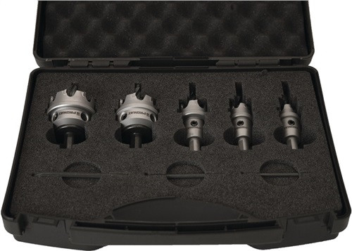 Flachschnitt · hartmetallbestückte Schneiden erlauben mehrmaliges Nachschleifen · auswechselbarer Zentrierbohrer · Auswurffeder für den Bohrkern für Materialstärken bis 4 mm bei unlegierten Stählen · Edelstahl bis 2 mm · Schnitttiefe 4 mm · Inhalt: je 1 Stück HM-bestückte Lochsäge Ø 16 / 20 / 25 / 32 und 40 mm je 1 Winkelschraubendreher SW 2,5 / 3,0 und 4,0 · Anwendungshinweis: Beim Sägen von Metallen hochwertiges Schneidöl verwenden, bei Guss kein Schneidöl verwenden und beim Sägen von Aluminium Petroleum zuführen
