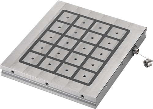 schnelle und sichere Spannmethode zum Spannen von magnetisierbaren Werkstoffen · Magnetspannplatte mit Quadratpoltechnik · maximale Haltekraft 8 Tonnen · Anwendung: Zum Einsatz in der Fräsbearbeitung, für schwere Fräsarbeiten und den HSC-Bereich · Spannung und Bearbeitung von unterschiedlichen Werkstücken durch individuelle Feldeinteilung möglich (Kraft / Pol = 4 kN) · bei vollständiger Belegung aller Pole (20 Stück) wirkt die angegebene maximale Haltekraft · optimal wirkt sich ebenfalls eine Werkstückstärke von mind. 12 mm auf die Haltekraft aus · Polverlängerungen dienen als Werkstück-Unterbau für die 5-Seiten Bearbeitung · Werkstück wird im Regelfall auf drei feste Polverlängerungen gespannt (Dreipunktauflage), auf alle anderen Pole werden bewegliche Polverlängerungen eingesetzt, die sich flexibel an die Werkstückkontur bzw. unebene Flächen anpassen · seitliche Nuten ermöglichen die Befestigung der Magnetspannplatte auf einem Maschinentisch · ebenso können Befestigungsbohrungen gesetzt werden Vorteile: hohe Haltekräfte · geringe Aufbauhöhe · Polverlängerungen ermöglichen 5-Seiten Bearbeitung ohne Störkante, einfache und schnelle Montage, ohne Verlust der Haltekräfte · Energie wird nur zum Spannen und Entspannen benötigt, dadurch geringe Betriebskosten · Weitere technische Eigenschaften Inhalt: 22 teilig • Ausführung: Platte mit 8t Haltekraft