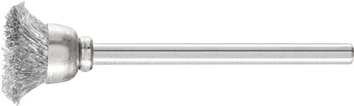 ungezopft · geeignet für leichte Bürstarbeiten wie Entgraten, Reinigen und Polieren · aufgrund des stirnseitigen Einsatzes mit der gesamten Bürstenoberfläche besonders für Bürstarbeiten auf kleinen Flächen geeignet · Bürsten mit Naturbesatz mit Polierpasten einsetzen, um das optimale Polierergebnis zu erzielen (Art.-Nr. 41 43 380 900, 41 43 380 901, 41 43 380 903, 41 43 380 904) · Schaft-Ø 3 mm · Weitere technische Eigenschaften Drahtstärke: 0,1mm • Schaft-Ø: 3mm • max. Drehzahl: 20000min-¹