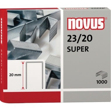 Präzise verarbeitet, hohe Drahtfestigkeit. · Material der Klammern: Stahl · Produktverwendung: Blockhefter · Typbezeichnung der Heftklammern: 23/20 SUPER · Heftleistung: 170 Bl. (80 g/m²) · Ausführung des Inhalts (Packung): 1.000 St./Pack. · Farbe: verzinkt