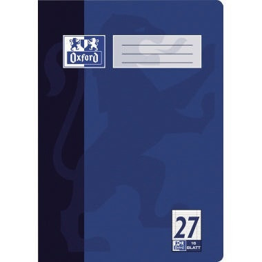 Oxford Schulheft DIN A4 liniert mit Rand innen/außen 27 90g/m² 16 Bl. · Farbe des Einbandes: dunkelblau · Zertifikat/Zulassung: EU Ecolabel · Typnummer der Lineatur: 27 · Papierformat: DIN A4 · Paper by Nature: Nein · Forest Stewardship Council (FSC): Nein · EU Ecolabel: Ja · Ausführung der Lineatur: liniert mit Rand innen/außen · Ausführung der Bindung: Drahtbindung · Anzahl der Blätter: 16 Bl. · Grammatur: 90 g/m²