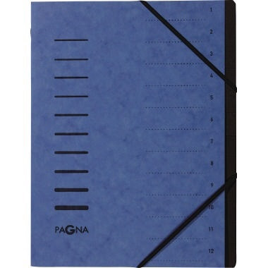 Mit schwarzem Griffregister für schnellen Zugriff auf Unterlagen. Der Deckel ist individuell beschriftbar. · Flächenmaße des Einbandes: 335 g/m² · Material des Einbandes: Pressspankarton · Grammatur: 280 g/m² · Greifausschnitt vorhanden: Ja · Verwendung für Papierformat: DIN A4 · Farbe des Fächerblocks: schwarz · Breite: 245 mm · Ausführung der Tabe: 01. Dez · Art des Verschlusses: Gummizugverschluss · Anzahl der Fächer: 12 Fächer · Maße: 24,5 x 32 cm (B x H) · Farbe: blau