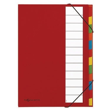 Mit dehnbarem Rücken. Eingelegte farbige Kartoneinlage zur Beschriftung plus blanko Ersatzeinlage zur individuellen Bedruckung über den PC. · Grammatur: 225 g/m² · Material des Einbandes: Karton, Polypropylenfolie kaschiert · Maße: 24 x 33 cm (B x H) · Verwendung für Papierformat: DIN A4 · Greifausschnitt vorhanden: Ja · Farbe des Fächerblocks: mehrfarbig · Breite: 240 mm · Ausführung der Tabe: blanko · Art des Verschlusses: Gummizugverschluss · Anzahl der Fächer: 12 Fächer · Farbe: rot · Höhe: 330 mm