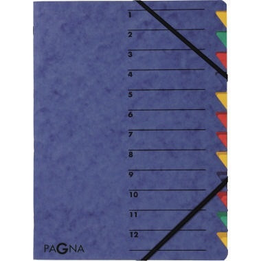 Mit buntem Griffregister. · Farbe: blau · Material des Einbandes: Pressspankarton · Maße: 24 x 32 cm (B x H) · Höhe: 320 mm · Grammatur: 265 g/m² · Verwendung für Papierformat: DIN A4 · Farbe des Fächerblocks: mehrfarbig · Breite: 240 mm · Ausführung der Tabe: 01. Dez · Art des Verschlusses: Gummizugverschluss · Anzahl der Fächer: 12 Fächer · Greifausschnitt vorhanden: Ja