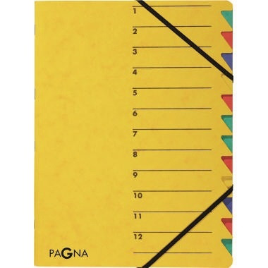 Mit buntem Griffregister. · Farbe: gelb · Verwendung für Papierformat: DIN A4 · Material des Einbandes: Pressspankarton · Maße: 24 x 32 cm (B x H) · Höhe: 320 mm · Grammatur: 265 g/m² · Farbe des Fächerblocks: mehrfarbig · Breite: 240 mm · Ausführung der Tabe: 01. Dez · Art des Verschlusses: Gummizugverschluss · Anzahl der Fächer: 12 Fächer · Greifausschnitt vorhanden: Ja