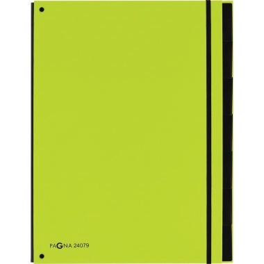 Ideal zum Vorsortieren von Belegen, Unterlagen und Informationen.Ideal auch zum Terminieren von Vorgängen etc. Taben aus Polypropylen in schwarz. Mit verstärktem und dehnbarem Rücken. · Anzahl der Sichtlöcher: 3 Sichtlöcher · Farbe des Fächerblocks: schwarz · Material des Einbandes: Karton, Polypropylenfolie kaschiert · Werkstoff: Karton · Maße: 26,5 x 34 cm (B x H) · Höhe: 340 mm · Farbe: lindgrün · Verwendung für Papierformat: DIN A4 · Beschriftungsschild auswechselbar: Nein · Ausführung des Inhalts (bezüglich der Hauptausstattungsteile: dehnbarer Rücken · Ausführung der Tabe: blanko · Art des Verschlusses: Gummizugverschluss · Anzahl der Fächer: 7 Fächer · Breite: 265 mm · Ausführung der Lieferzusammenstellung: inkl. verstärktem, dehnbarem Rücken