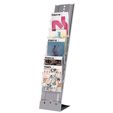 Bodenständer mit Sockelplatte. Sekundenschnelle Montage durch einfaches Stecksystem. Einfach zu transportieren. · Ausführung des Fußes: Standfuß · Werkstoff: Metall, pulverbeschichtet · Verwendung für Papierformat: DIN A4 · Tiefe: 360 mm · Maße: 25 x 115 x 36 cm (B x H x T) · Masse (Gewicht): 6,5 kg · Höhe: 1150 mm · Farbe: transparent · Farbe des Gestells: alu · Beschreibung der Besonderheiten: sekundenschnelle Montage durch einfaches Stecksystem, einfac · Ausführung der Lieferzusammenstellung: Inkl. Transporttasche · Anzahl der Fächer: 7 Fächer · Breite: 250 mm
