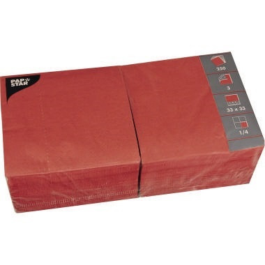 Weiche, dekorative Servietten in einer Klarsichtpackung. · Forest Stewardship Council (FSC): Ja · Maße: 33 x 33 cm (B x L) · freier Inhalt: 250 St./Pack. · Ausführung der Falzung: 1/4-Falz · Anzahl der Lagen: 3-lagig · Farbe: rot