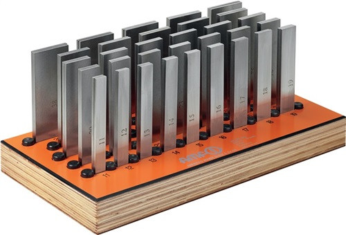 im Holzständer · paarweise planparallel feingeschliffen · Größenangaben auf dem Produkt · Paartoleranz tp in der Höhe IT 5 · Nennmaßtoleranz in der Höhe ±0,01 mm · restliche Maße nach DIN ISO 2768m  Größe 24, Inhalt je 1 Paar: 3x11 / 3x13 / 3x15 / 3x16 / 3x17 / 3x18 / 3x20 / 3x21 / 3x22 / 3x23 / 3x25 / 3x26 / 3x27 / 3x28 / 3x30 / 3x31 / 3x32 / 3x33 / 3x35 / 3x36 / 3x37 / 3x38 / 3x40 / 3x42 mm (BxH)  Größe 32, Inhalt je 1 Paar: 3x11 / 3x12 / 3x13 / 3x14 / 3x15 / 3x16 / 3x17 / 3x18 / 3x19 / 3x20 / 3x21 / 3x22 / 3x23 / 3x24 / 3x25 / 3x26 / 3x27 / 3x28 / 3x29 / 3x30 / 3x31 / 3x32 / 3x33 / 3x34 / 3x35 / 3x36 / 3x37 / 3x38 / 3x39 / 3x40 / 3x41 / 3x42 mm (BxH) Diese Unterlagen werden als Unterlegstücke für Werkstücke bei den verschiedensten Bearbeitungsvorgängen verwendet. ·  Weitere technische Eigenschaften Satzinhalt: 24Paar