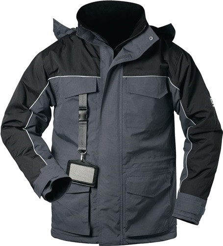 Obermaterial: 100 % Polyamid mit atmungsaktiver PU-Beschichung · Futter: 100 % Polyester Polar-Fleece · hoch atmungsaktiv · wind- und wasserdicht · Nähte verschweißt · Reflexpaspel vorn, hinten und an den vorderen und rückwärtigen Ärmelseiten · strapazierfähiges und abriebfestes Nylon-Taslan Gewebe · Ausweis-Karten-Halter an abclipbarem Schlüsselband mit Metall-Karabiner · abzippbare Sturmkapuze · hoher Kragen mit Fleecefutter zum Schutz vor Witterung · warmes Fleece-Innenfutter im Oberkörperbereich · wattiertes Stepp-Taftfutter im Rumpf- und Ärmelbereich · einfache Emblem-Anbringung durch Reißverschluss im Futter · 2 Brusttaschen · 2 Hüfttaschen · 1 Brustinnentasche · Atmungsaktivität: 5000 g/m²/24 h · Wassersäule: 8000 mm