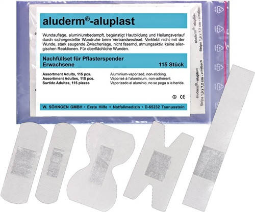 komplette Nachfüllung von 5 Sets mit 115 Wundpflastern in folgenden Ausführungen: je 30 aluderm®-aluplast Strips ca. 7,2 x 1,9 cm und ca. 7,2 x 2,5 cm 25 aluderm®-aluplast Fingerkuppenverbände 20 aluderm®-aluplast Fingerverbände ca. 12 x 2 cm 10 aluderm®-aluplast Fingergelenkverbände · Weitere technische Eigenschaften Inhalt: 115St. • passend für: Spender 40 00 386 100