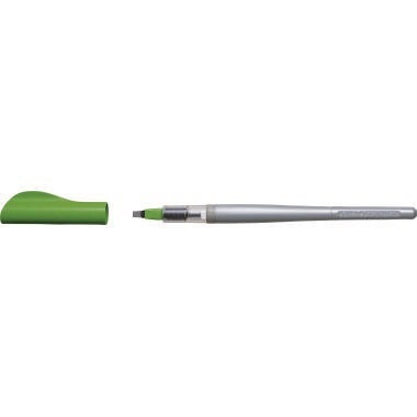 Mit Schraubkappe und lasergeschnittener Feder. Ideal zum Gestalten von Tisch- oder Geburtstagskarten. Spitze aus zwei parallelen Platten für eine schöne, klare Handschrift. · Farbe des Clips: grün · Typbezeichnung der Tintenpatrone: Tintenpatrone 1108 · Strichstärke: 3,8 mm · Material des Schaftes: Kunststoff · Material des Clips: Kunststoff · Farbe des Schaftes: silber/transparent · Farbe der Kappe: grün · Ausführung der Lieferzusammenstellung: inkl. 1 Patrone 1108 schwarz, 1 Patrone 1108 rot, Spitzenrei · Ausführung der Griffzone: rund · Material der Schreibfeder: Edelstahl