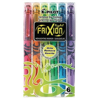 Innovativer, radierbarer Textmarker. Ausgestattet mit der patentierten, metamorphen FRIXION Tinte. Mittels der Kunststoffspitze am Schaftende und der erzeugten Reibungswärme (ab ca. 60 °C) kann das Markierte weggerieben werden. Kälte bewirkt den Umkehreffekt. Eine kurze Zeit im Gefrierfach (ab ca. -10 °C) lässt die Schrift wieder erscheinen. · kann einige Tage offen liegen bleiben ohne einzutrocknen: Nein · max. Temperaturbereich: 60 °C · nachfüllbar: Nein · schattenfrei kopierbar: Nein · Schreibfarbe: gelb, grün, pink, orange, blau, violett · Strichstärke: 1-3,8 mm · inkjet geeignet: Nein · Spitze austauschbar: Nein · Farbe des Schaftes: gelb, grün, pink, orange, blau, violett · Druckmechanik vorhanden: Nein · Clip vorhanden: Ja · Bezeichnung der Schreibflüssigkeit: Tinte · Ausführung des Inhalts mit Packung: 6 St./Pack. · Ausführung der Vorschubmechanik: Kappenmodell · Ausführung der Spitze: Keilspitze · Ausführung der Farbe: farbig sortiert · Ausführung der Griffzone: rund