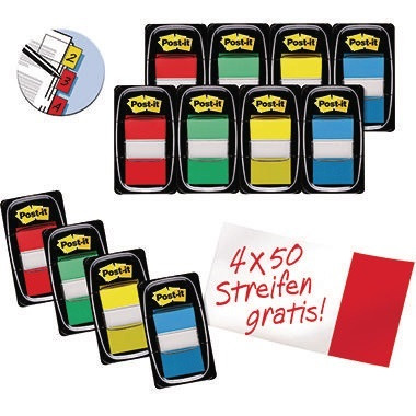 Schneller finden was wichtig ist! Post-it® Index Haftstreifen - zum Markieren und Strukturieren. Mit den signalstarken Farben der Post-it® Index Haftstreifen können Sie Ihre Kataloge, Bücher und Listen wirkungsvoll markieren und Wichtiges schneller wiederfinden. · Anzahl der Blätter: 50 Bl./Block · Höhe: 43,2 mm · PEFC: Nein · Werkstoff: Polyester · mehrfach verwendbar: Ja · Maße: 25,4 x 43,2 mm (B x H) · Breite: 25,4 mm · Blauer Engel: Nein · beschriftbar: Ja · Ausführung der Lieferzusammenstellung: inkl. 4 x 50 Bl. Post-it® Index Standard gratis · Ausführung des Inhalts (Packung): 12 Block/Pack. · Farbe: rot, gelb, blau, grün