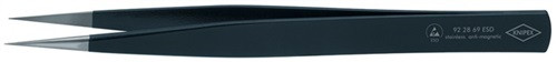 Chrom-/ Nickel-Stahl: rostfrei, anti-magnetisch (18/10) · nicht härtbar · sehr gängige Elektronik-Qualität · ESD-Beschichtung: blendfrei schwarz, mit einem Oberflächenwiderstand von ca. 10^5 Ohm · Spitzen blendfrei gebürstet · Greifflächen mattiert für optimalen Halt · Chrom-Nickel-Stahl, rostfrei, antimagnetisch · eckige Spitzen, ca. 0,9 mm breit · Greifflächen fein gezahnt · Weitere technische Eigenschaften Oberfläche: rostfrei, antimagnetisch, elektrisch ableitend