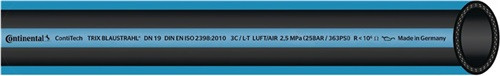 nach DIN EN ISO 2398 : 2010 Typ 3C / L-T · schwarze, porenfreie, glatte NBR-Innenschicht · Betriebsdruck bis 25 bar (Angaben bei Raumtemperatur) · Druckträger: synthetische Garne · NBR-Außenschicht, unempfindlich gegen Ozon, Witterung und UV-Strahlung, abriebfest · hochflexibel und robust · ab DN 28 CR-Außenschicht, stoffgemustert · Temperaturbereich: -40 °C bis +85 °C · sehr gute Ölbeständigkeit, RMA Class A · längenunabhängig elektrisch leitfähig, R Kennzeichnung: 6 blaue, axial verlaufende Streifen auf schwarzem Untergrund, „Continental ContiTech TRIX® BLAUSTRAHL® DN 19 DIN EN ISO 2398 : 2010 3 C / L-T Luft/Air 2,5 MPa (25 bar) R Einsatzmöglichkeiten: Der TRIX®-Blaustrahl ist das Spitzenprodukt für den schweren Einsatz im Druckluftbereich. Der Schlauch entspricht der Norm DIN EN ISO 2398 und ist das Top-Arbeitsgerät für Industrie, Bergbau, Steinbrüche, Hoch- und Tiefbau, Hüttenindustrie, Werften, Druckluftgeräte- und Kompressorenhersteller, Tankstellen, Großgaragen und viele andere Bereiche. LOBA (Landesoberbergbauamt) Ausführung auf Anfrage. · Weitere technische Eigenschaften Gewicht: 0,41kg/m